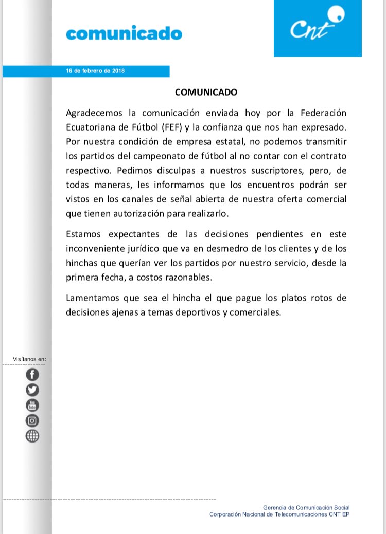 La Corporación Nacional de Telecomunicaciones (CNT) publicó un comunicado en el que informan que no televisarán la primera fecha del Torneo Nacional de Fútbol. Esto porque no cuentan con el contrato respectivo, por lo que solo se podrían observar, en CNT TV, los juegos que salgan por los canales de aire.